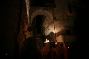 Alle ore 21:00 circa inizia il caratteristico “percorso a luci spente” lungo i dedali del borgo antico. I balconi delle abitazioni vengono addobbati dalla Pro Loco Quadratum con i segni caratteristici della pietà popolare coratina (croci e lenzuola bianche con segno di lutto), le luci della pubblica illuminazione rimangono spente e i vicoli sono illuminati solamente dalla luce fioca dei lumini posizionati sui balconi e cornicioni e dalle candele che vengono portate in processione da tutti i partecipanti.