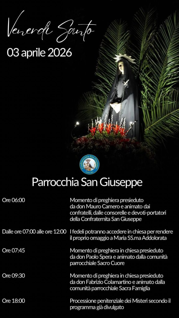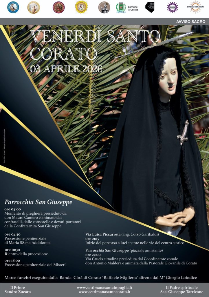 La processione di Maria SS.ma Addolorata segna l’inizio dei riti della Settimana Santa coratina e rappresenta un momento di profonda spiritualità e devozione. Essa è organizzata dalla Confraternita San Giuseppe.